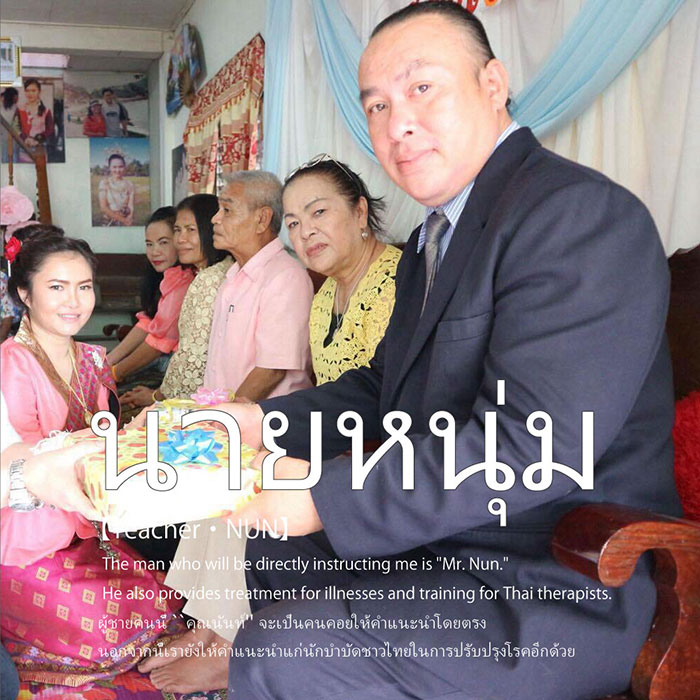 A therapist living in Chiang Mai will be directly in charge of one-on-one instruction. To tell you the truth... he is the son of the first principal, Maker Ron, and is currently in charge of lessons as the second principal. He is a therapist who performs therapeutic treatments called Mo Nuat, and has recently become very popular for helping clients who are not feeling well improve their condition. All courses are available. He will directly teach you the basic Thai traditional massage Chiang Mai style, the advanced Thai traditional massage Jap Sen, the testicular massage Jap Kasai, and the uterine ovarian massage Yok Thong. |