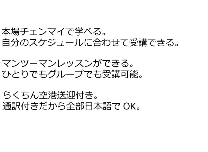 You can study Traditional Thai Massage at Chiangmai THAILAND. We pick you up at the airport and take you to the hotel. The next day, You can take lesson at your room. Because Teacher will visit your room. As interpreter is attached, Japanese OK,English OK. There is no problem with one or a few groups. We are offering to inexperienced course, experienced course, testicular massage course, longstay professional lesson course. We will send you back to the airport on the way back. As it is a complete reservation system, please contact us in advance in advance. You can rest assured that all reservations and payments are handled at the Japanese office.